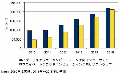 IDC Japanは、国内クラウドコンピューティング向けソフトウェア市場予測を発表した。2015年にはパブリッククラウド向けで2194億円、プライベートクラウド向けで2126億円になると見込む。